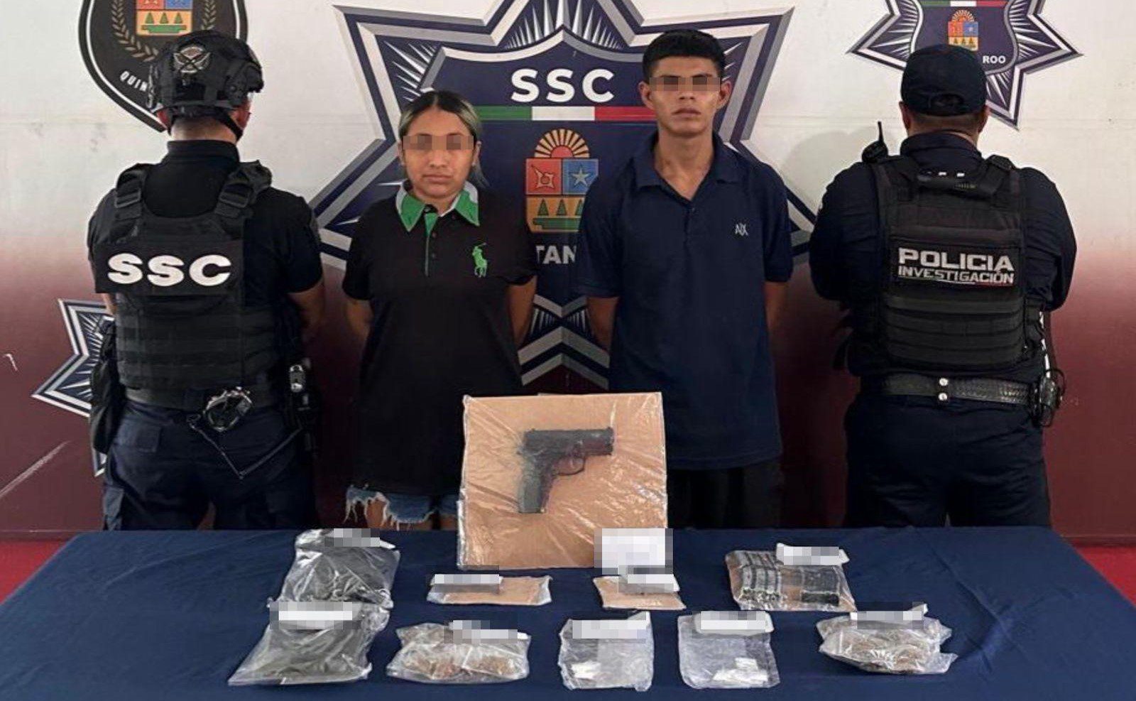 A la pareja se le aseguró 40 envoltorios de hierba seca, 16 de polvo blanco, dos cargadores para arma larga, cartuchos de calibre .9 y .233 milímetros, así como una réplica de arma de fuego.