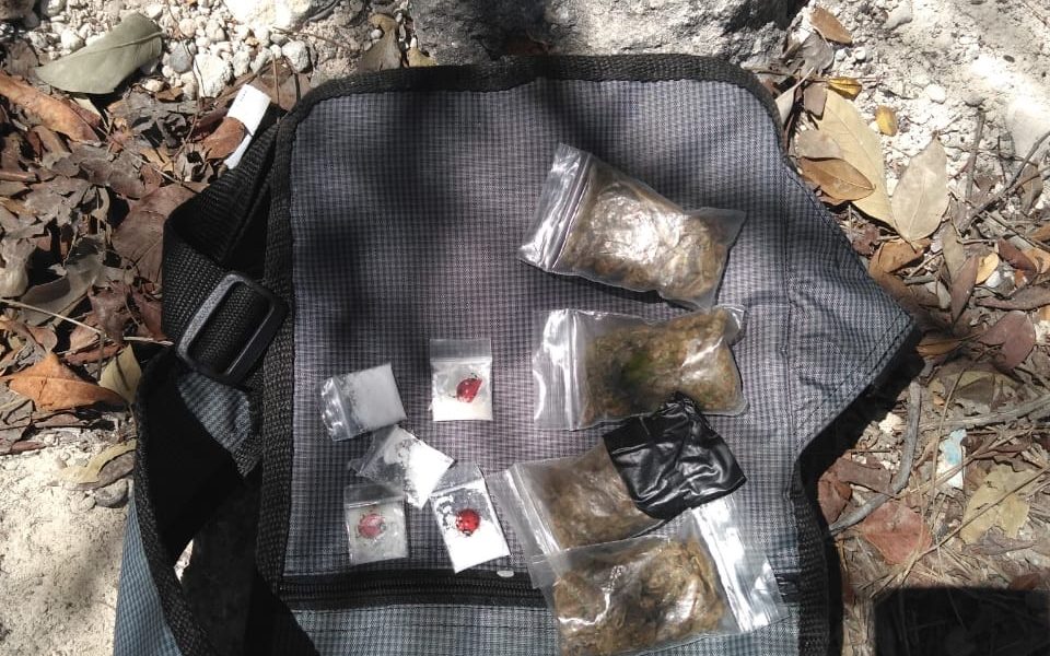 Por su actitud evasiva al notar la presencia de la policía, se le realizó una revisión de rutina al joven y se encontró entre sus pertenencias bolsitas que contenían al parecer mariguana y cocaína.