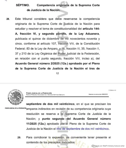El proceso llegó al máximo tribunal luego de que el Tercer Tribunal Colegiado del Vigésimo Séptimo Circuito, con sede en Cancún, determinara que corresponde a la SCJN revisar el tema de constitucionalidad relacionado con el artículo 144 A, fracción VI, de la Ley Aduanera.