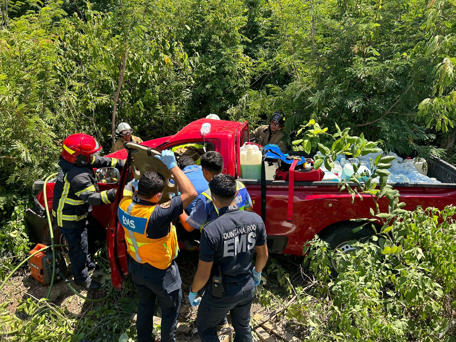 PLAYA DEL CARMEN, Quintana Roo, 23 de septiembre –  Chocan dos camionetas en la carretera federal 307, dejando como saldo dos personas gravemente heridas una de ellas tuvo que ser rescatada dentro de los fierros retorcidos de su vehículo, por personal de Bomberos y paramédicos.