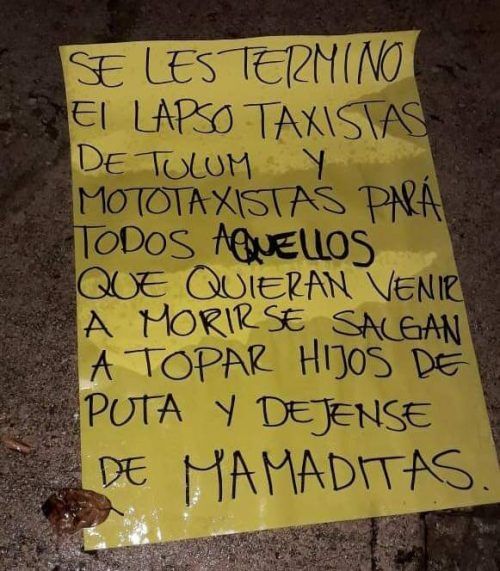 El pasado domingo estalló la violencia en contra de los taxistas de Tulum que viven en el fraccionamiento Puerto Maya, al ser incendiado tres de sus unidades trabajo, posterior a lo cual, fueron colocados dos narcomantas en el que fueron amenazados de muerte y se les ordenó irse del poblado Puerto Aventuras o de lo contrario se van a morir, lo que ocurrió la noche de hoy martes.