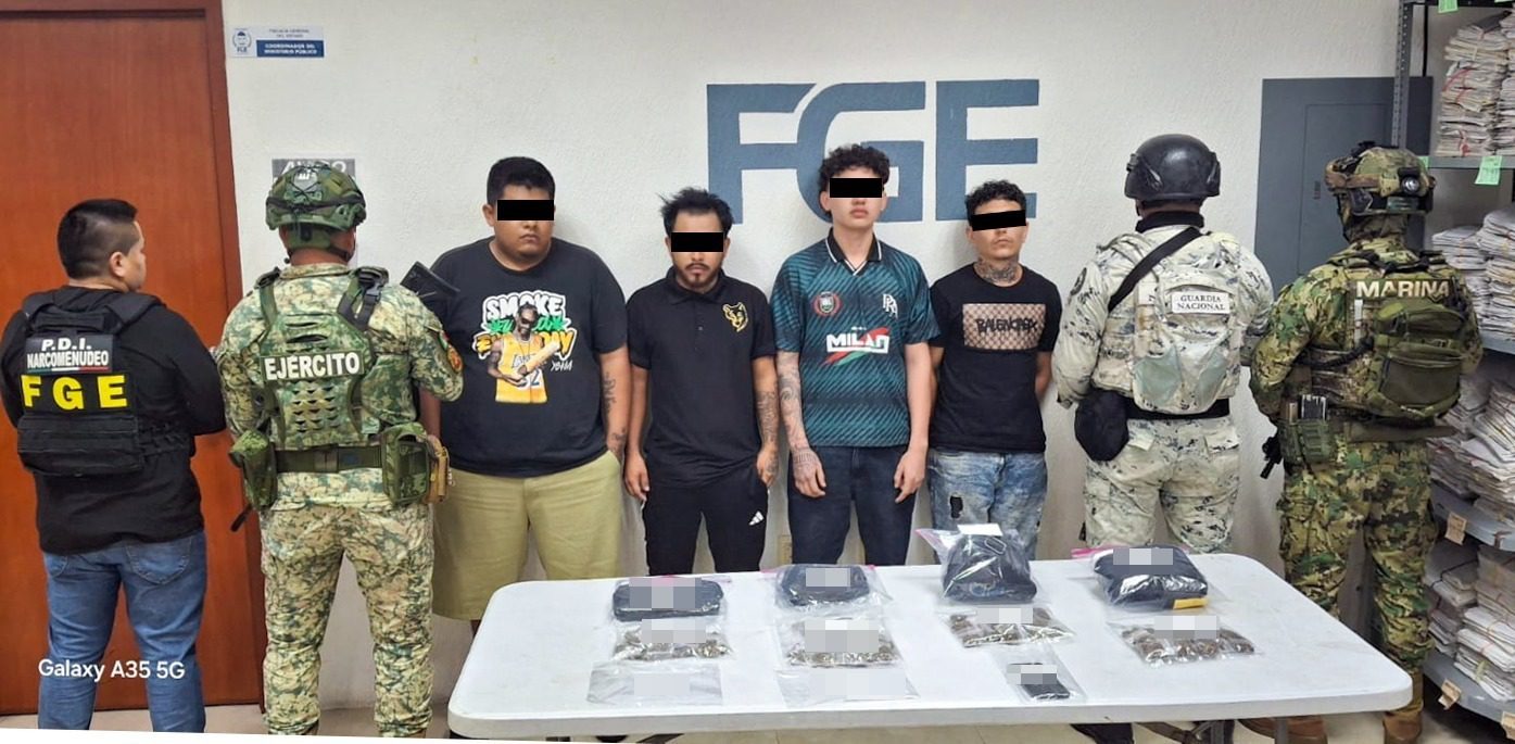 Cerca del lugar, las autoridades detectaron a cuatro hombres que intercambiaban bolsas, por lo que realizaron una revisión en la que hallaron hierba verde similar a la marihuana. Tras ello, fueron detenidos Jhonatan Alberto “N”, José Gabriel “N”, Antony Emanuel “N” y Sayir Aurelius “N”.