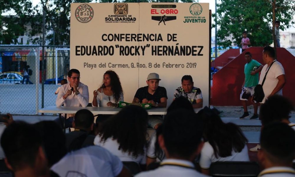 PAYA DEL CARMEN, Quintana Roo 9 de Febrero 2019.- El pugilista Eduardo ‘Rocky’ Hernández compartió su experiencia de vida con los jóvenes solidarenses para incentivarlos a alejarse de las adicciones y de conductas delictivas por medio de la práctica deportiva, la cual deja más satisfacciones para quien lo toma como un estilo de vida. Agradeció también al gobierno municipal que encabeza Laura Beristain Navarrete y al Instituto de la Juventud por realizar este tipo de acciones.
