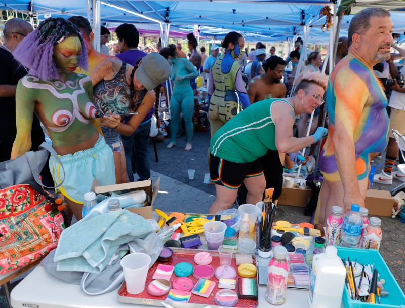 Resguardadas bajo unas improvisadas carpas para protegerse del agobiante calor, unas 45 personas han cedido hoy sus cuerpos desnudos a 35 artistas en la neoyorquina plaza de Union Square para expresar la aceptación de lo que somos y la alegría de vivir.