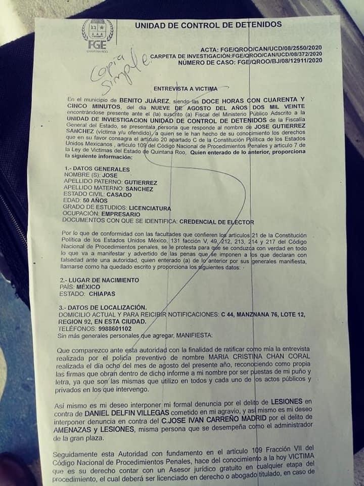 CANCÚN, Quintana Roo, 12 de agosto.- José Gutiérrez Sánchez locatario de la Gran Plaza en Cancún interpuso una denuncia ante la Fiscalía General del Estado bajo la carpeta de investigación número 08/ 372/ 2020 por lesiones y amenazas en contra del administrador José Iván Carreño Madrid y Daniel Delfin Villegas.