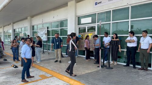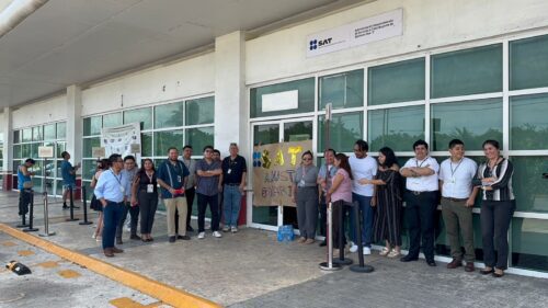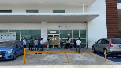 CANCÚN, Quintana Roo, 15 de octubre de 2025.— Trabajadores del Servicio de Administración Tributaria (SAT) en Cancún realizaron un paro de labores de brazos caídos, sumándose a la protesta nacional para exigir el pago del ajuste salarial retroactivo que —aseguran— ya fue otorgado al personal sindicalizado, pero sigue pendiente para los empleados de confianza.
