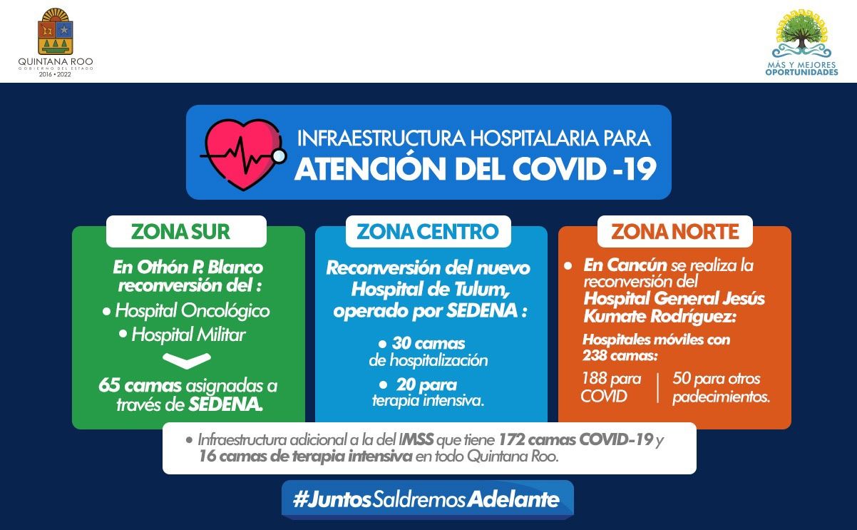 Carlos Joaquín explicó que estos espacios estarán listos a partir de mañana y 3 días después se abrirá la segunda y unos días después, la tercera parte con la que se tendrá un total de 300 camas disponibles para atender a pacientes con Covid-19.