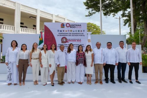 CHETUMAL, Quintana Roo, 08 de octubre de 2025.- La gobernadora Mara Lezama Espinosa encabezó la ceremonia de izamiento de la bandera de Quintana Roo en ocasión del 51 aniversario de su creación como Estado Libre y Soberano, evento en el que se estrenó la Banda de Guerra Monumental de más de 112 elementos, niños y jóvenes, así como las escoltas de Bandera Nacional y Estatal que se integra con 8 organizaciones cívicas libres y planteles educativos.