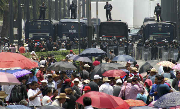 Los manifestantes se mantienen concentrados frente a Palacio Nacional, donde en estos momentos realizan un mitin. Decenas de elementos de la Secretaría de Seguridad Pública capitalina se mantienen concentrados en las inmediaciones del lugar. (FUENTE: La Jornada)