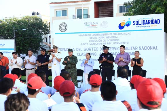 PLAYA DEL CARMEN, Quintana Roo, 13 de noviembre.- La Presidenta Municipal de Solidaridad, Cristina Torres Gómez, encabezó la ceremonia del sorteo del Servicio Militar Nacional para la clase 1998, anticipados y remisos, en la Plaza Cívica “28 de Julio”, ante autoridades de la Secretaría de Marina y de la Defensa Nacional, entre otras.
