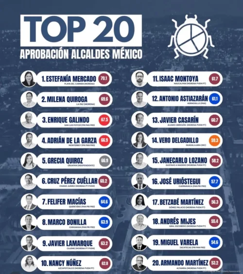 De acuerdo con Data Polls Mx, estos resultados reflejan la percepción ciudadana sobre el desempeño de los gobiernos municipales, considerando aspectos como cercanía con la población, resultados en servicios públicos, seguridad, obra pública y programas sociales.