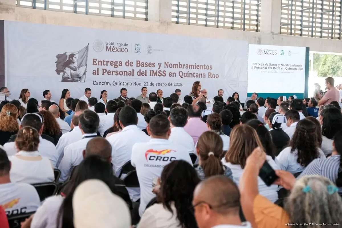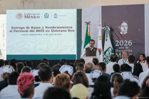 Cancún, 23 de enero de 2026.– Un total de 71 colaboradoras y colaboradores del Instituto Mexicano del Seguro Social (IMSS) en Quintana Roo recibieron sus bases laborales durante un evento encabezado por la gobernadora Mara Lezama Espinosa y el director general del IMSS, Zoé Robledo.