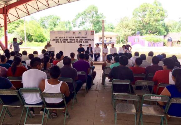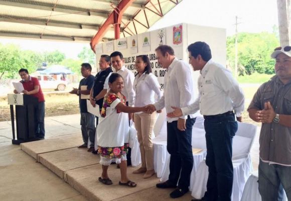 FELIPE CARRILLO PUERTO, Quintana Roo, 26 de Junio.- Es interés del Gobernador Carlos Joaquín dar certeza jurídica sobre la tenencia de la tierra tanto a familias de la ciudad como de la zona rural, expresó el secretario de Desarrollo Urbano y Vivienda (Seduvi), Carlos Ríos Castellanos, durante la entrega de 279 Títulos de Solares Urbanos a ejidatarios de la comunidad Chumpón, perteneciente al ejido Chunyaxché, del municipio Felipe Carrillo Puerto.