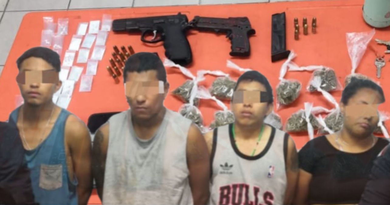 Los ahora detenidos tenían posesión de un arma de fuego, una réplica de arma, 20 cartuchos útiles calibre 9 milímetros, 20 bolsas con lo que parece ser la droga llamada piedra,18 bolsas con polvo al parecer cocaína, 18 bolsas con vegetal verde al parecer marihuana y 5 bolsas con posible cristal.
