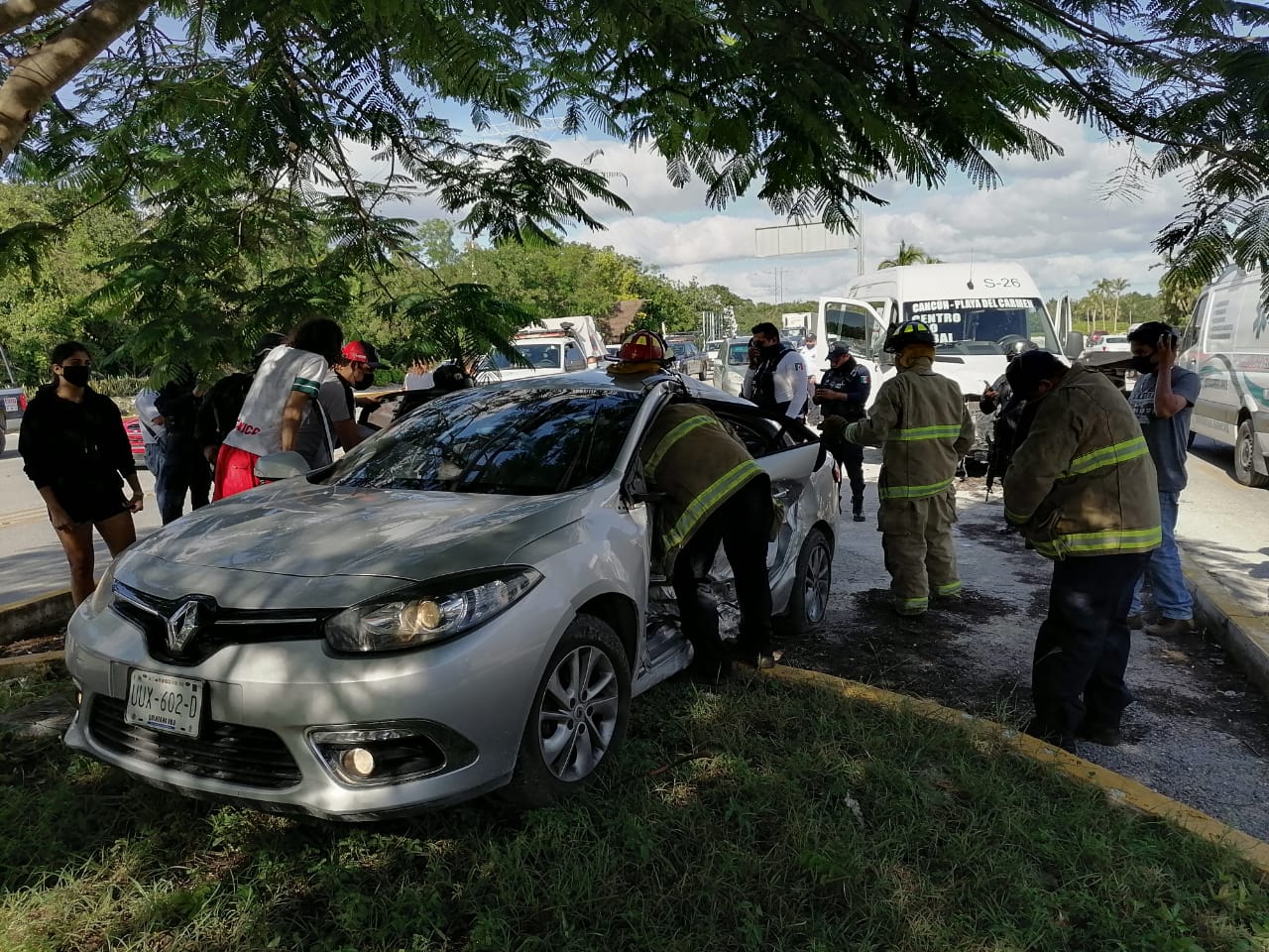 Fuerte accidente se registró sobre el Boulevard playa del Carmen a la altura del hotel Princess, luego de que conductor de un vehículo particular marca fluence Renault color gris con placas UUX-602-D, realizará una mala maniobra al tratar de ganarle el paso a una van de transporte público de la ruta playa-cancun con económico S-26, que circulaba a exceso de velocidad.