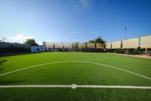 De acuerdo a las especificaciones del campo y lo que lo hace resiliente al cambio climático es que se elevó el terreno para crear un pendiente que evita inundaciones y encharcamientos en temporada de lluvias; tiene un diseño bioclimático con adaptaciones de sombreado con malla-sombra y muro vegetal, creando un microclima ante las altas temperaturas; también se hizo instalación de bebedores ecológicos que capturan y tratan el agua de lluvia, para reducir el uso del PET y se colocó un pasto sintético hecho a partir de caucho reciclado.