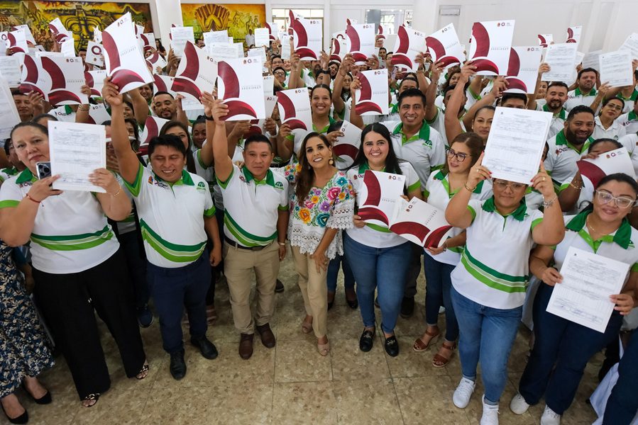 Chetumal.- La gobernadora Mara Lezama Espinosa acompañada por la secretaria de Educación en Quintana Roo, Elda Xix Euán, entregó nombramientos de base a docentes del Telebachillerato Comunitario, dando certeza jurídica a su situación laboral, luego de 13 años de trabajo bajo contratos y se reconoce su vocación, compromiso y dedicación con las y los jóvenes de aproximadamente 170 comunidades rurales del estado.