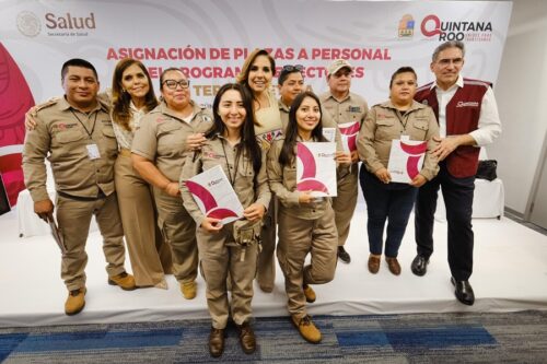 Acompañada por la presidenta honoraria del Sistema DIF Quintana Roo, Verónica Lezama Espinosa, y el secretario de Salud en el estado, Flavio Carlos Rosado, la mandataria destacó que, tras varios años de espera, hoy 39 trabajadoras y trabajadores reciben certeza laboral como un acto de justicia social que reconoce su esfuerzo, dignifica su labor y contribuye a la consolidación de un sistema de salud más sólido.