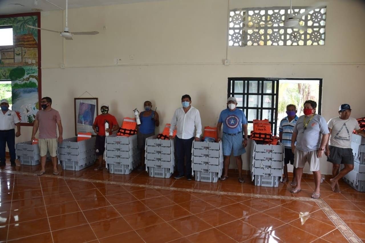 QUINTANA ROO, 7 de agosto.- La SEDARPE entregó apoyos para equipamiento a la Sociedad Cooperativa de Producción Pesquera “Pescadores de Vigía Chico”, de Punta Allen, consistentes en 304 sombras langosteras, 15 radios portátiles, 56 chalecos salvavidas, 14 extintores y 64 cajas de transporte de langosta viva, con una inversión de 661mil 890 pesos.