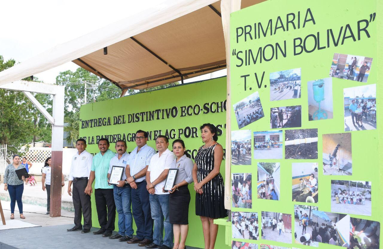 PUERTO MORELOS, Quintana Roo, 17 de junio .- En reconocimiento a la implementación de programas de sensibilización para el cuidado del medio ambiente, la Escuela Primaria “Simón Bolívar”, turno vespertino, y la Secundaria Técnica Número 10, “Francisco Zarco”, de esta delegación municipal, recibieron hoy el distintivo Eco Schools (Bandera Verde).