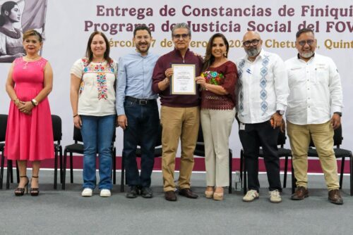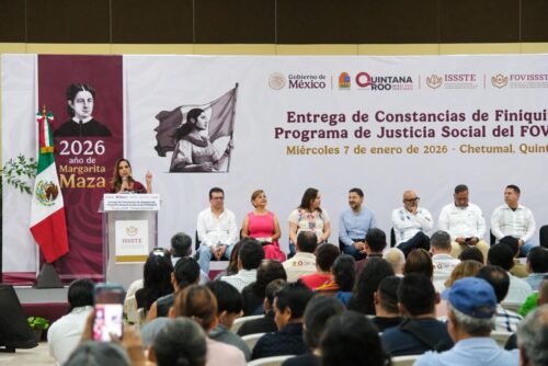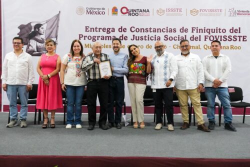 Chetumal, Quintana Roo, 7 de enero de 2026.– Un total de 300 derechohabientes del ISSSTE que tenían deudas impagables con el FOVISSSTE recibieron su constancia de finiquito y regresaron a su casa sin deber un solo peso a ese Fondo, luego de un evento que encabezaron la gobernadora Mara Lezama Espinosa y el director general del Instituto, Martí Batres.