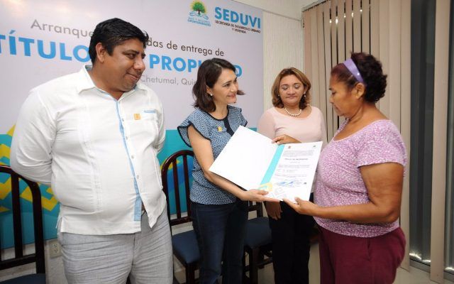 CHETUMAL, Quintana Roo, 28 de Abril.- La Secretaría de Desarrollo Urbano y Vivienda (Seduvi) inició el Programa “Entrega de Títulos a Domicilio”, con el que pretende otorgar más de 100 títulos de propiedad a igual número de familias en la capital del Estado, que luego de más de 15 años de espera, por fin tendrán certeza jurídica sobre su patrimonio.