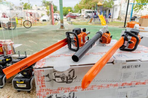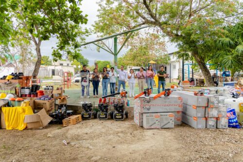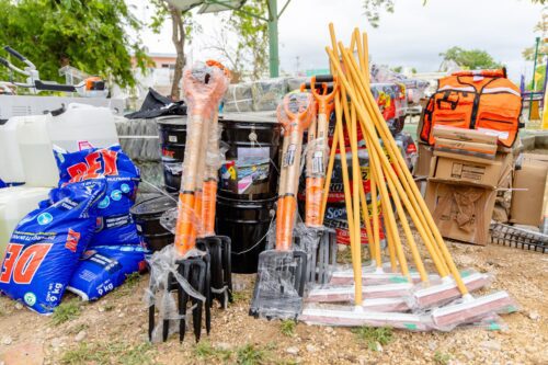 Detalló que, entre los artículos entregados, se encuentran: 16 mil kilos de bolsas de plástico, rastrillos, pintura de aceite, tiner, botas de uso rudo e impermeables, caretas, cascos, guantes y gafas de protección, ademas de herramientas como sopladores, cortacetos y flexómetros.