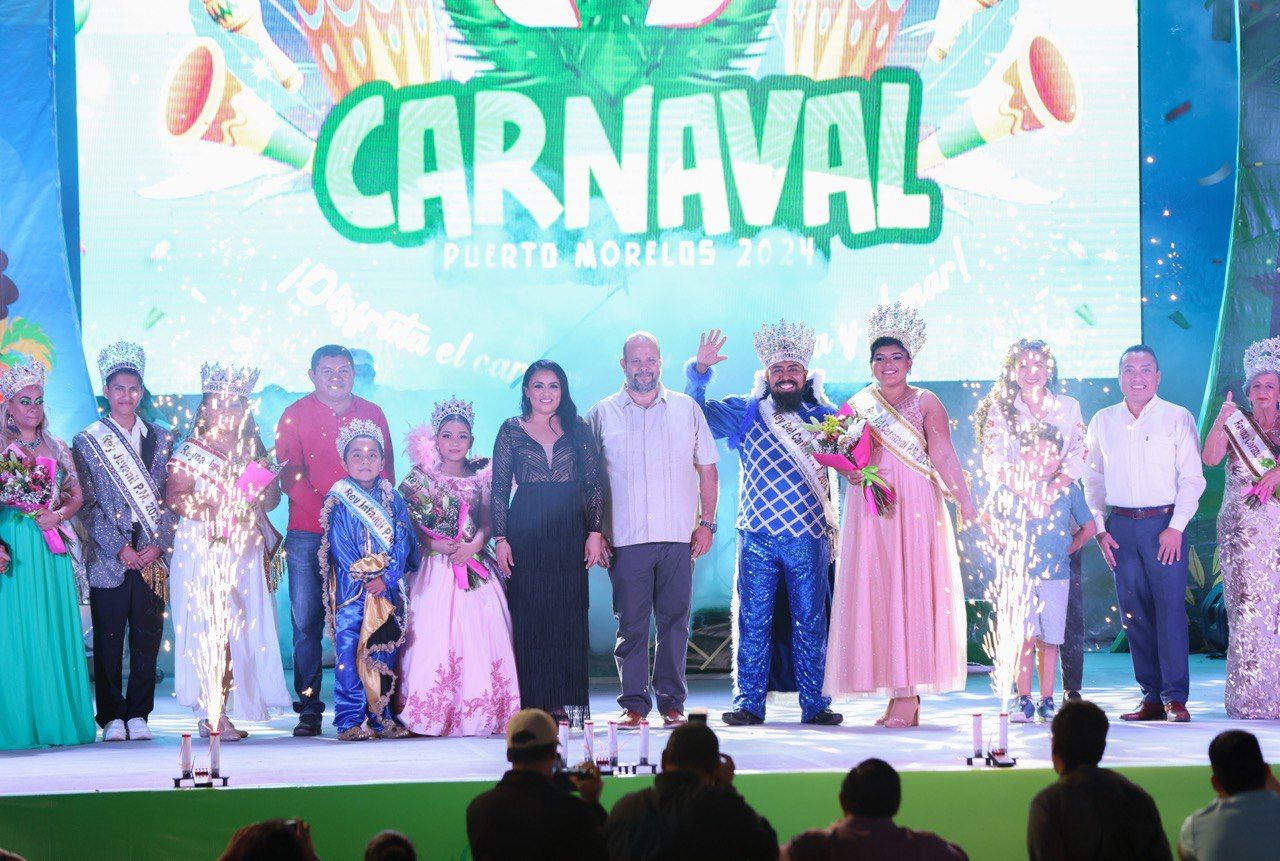 PUERTO MORELOS, Quintana Roo, 03 de febrero.- La presidenta municipal Blanca Merari Tziu Muñoz coronó anoche a los reyes del Carnaval de Puerto Morelos 2024, “Entre la selva y el mar”, en lo que fue el arranque de esta tradicional festividad, que tuvo lugar en el campo de beisbol de la colonia Pescadores ante miles de asistentes.