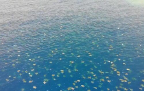 De acuerdo a DES, se trata de la colonia de tortugas verdes (Chelonia mydas) más grande del mundo. Un dron filmó a los reptiles en la Gran Barrera de Coral, congregándose en la costa de la isla Raine y preparándose para el desove (poner los huevos).