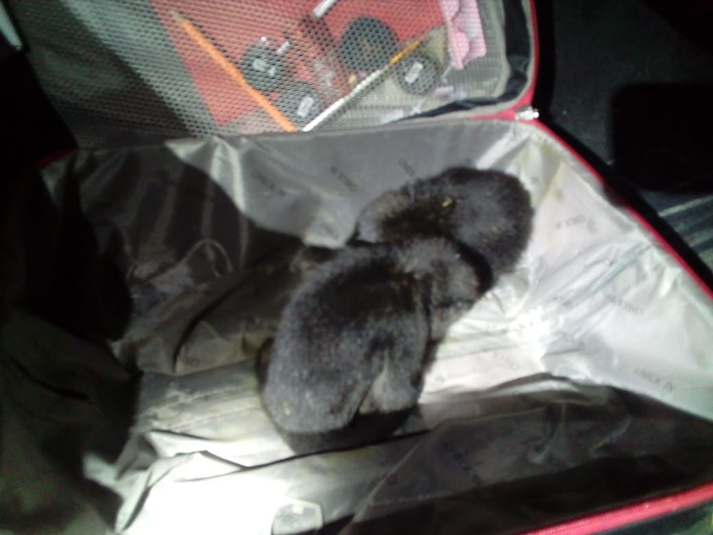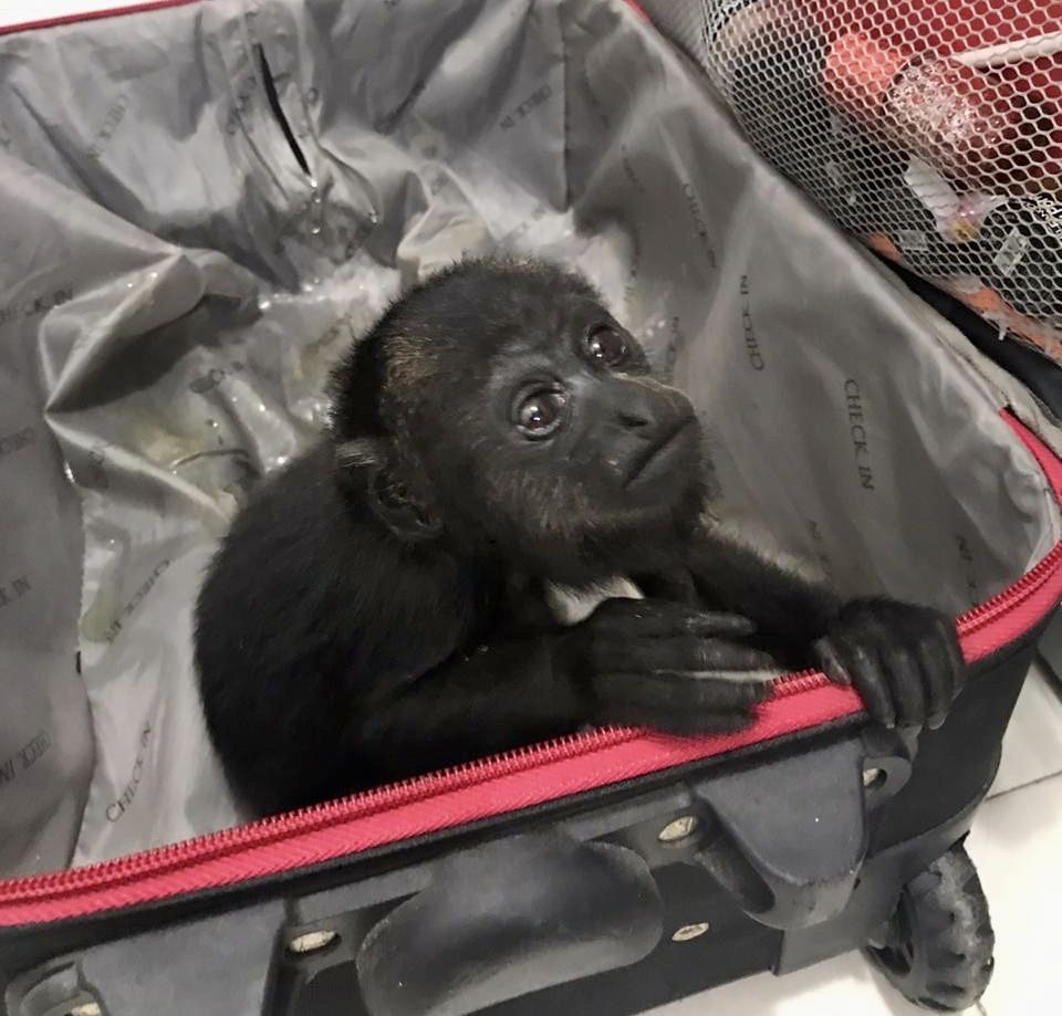 En una tarjeta informativa, se indicó que la unidad fue detenida por faltas al reglamento de tránsito y fue así que escucharon sonidos extraños que provenían de una maleta; al abrirla hallaron dos ejemplares silvestres de primates mono saraguato o aullador, los cuales están sujetos a protección especial.