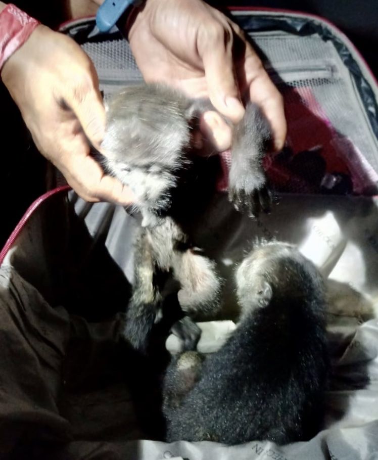 BACALAR, Quintana Roo, 06 de agosto.- Oficiales de la Guardia Nacional que patrullaban tramo carretero en Bacalar, rescataron dos ejemplares de mono aullador que eran transportados dentro de una maleta, sin las medidas de seguridad recomendadas por autoridades ambientales.