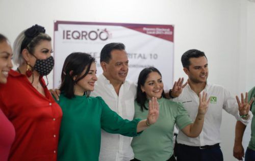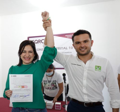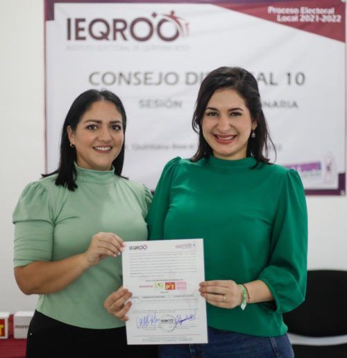 “Estoy muy orgullosa de encabezar este proyecto incluyente en el que la gente de Playa del Carmen se sienta partícipe de su futuro y del verdadero cambio que se avecina”, dijo Estefanía Mercado tras recibir junto con su suplente, Laura Corrales Navarrete, el documento que las acredita como candidatas por la Coalición “Juntos Hacemos Historia” de manos de Alejandra Guadalupe Medina Dzul, presidenta del Consejo Distrital X del Instituto Electoral de Quintana Roo (IEQROO).