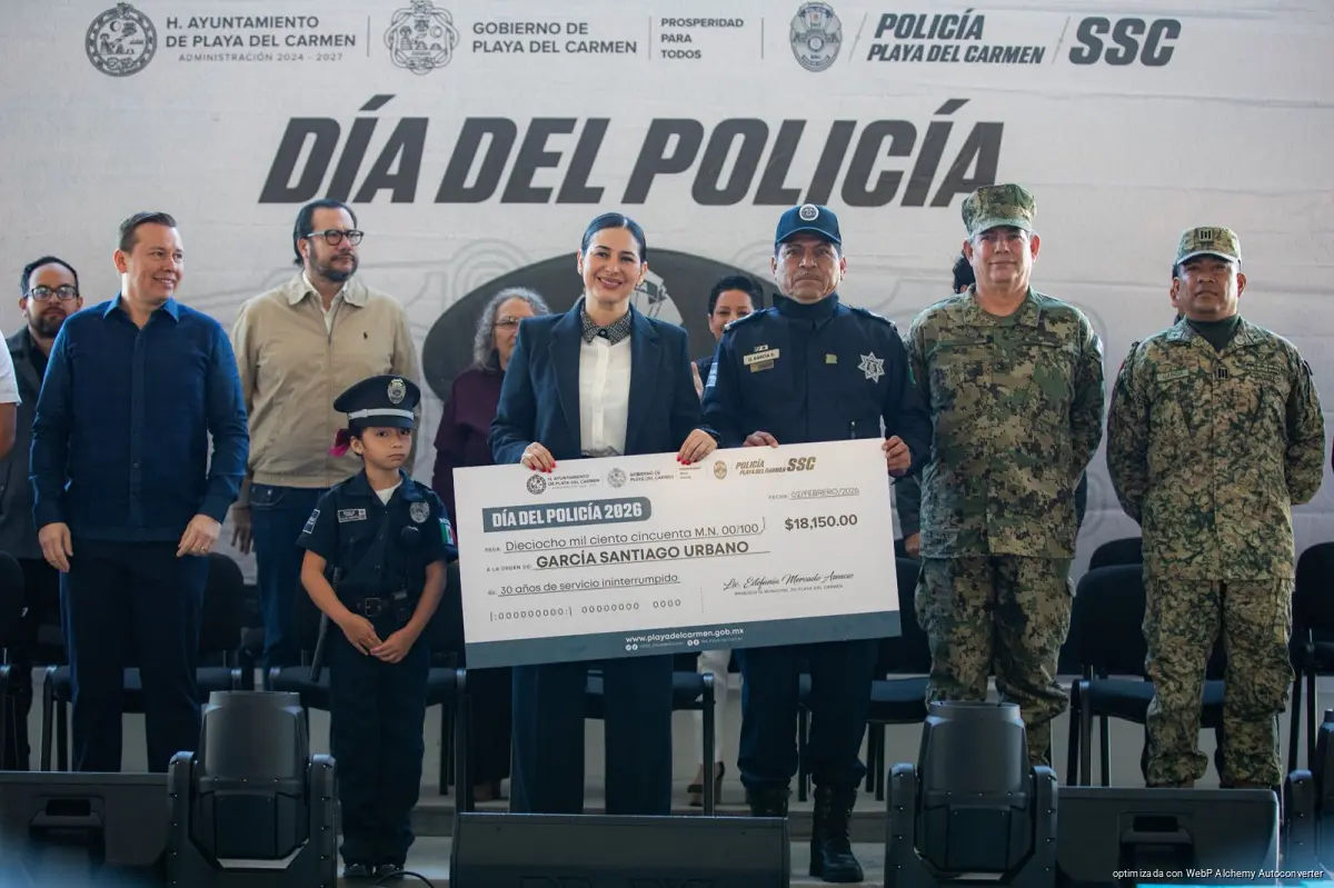 Playa del Carmen, Quintana Roo, 2 de febrero de 2026.— En el marco de la conmemoración del Día del Policía, la presidenta municipal Estefanía Mercado reconoció la vocación, disciplina y valentía de mujeres y hombres que integran la Secretaría de Seguridad Ciudadana Municipal (SSCM), a quienes entregó bonos y estímulos económicos por 10, 15, 20, 25 y 30 años de servicio.