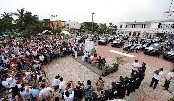 PLAYA DEL CARMEN, Quintana Roo, 8 de Julio.- Una sociedad fuerte evita que se caiga en actos de delincuencia, por ello trabajamos en esquemas de prevención del delito y en recomponer el tejido social, para dar seguridad, tranquilidad y paz a las familias, señaló el gobernador Carlos Joaquín al encabezar la ceremonia de entrega de parque vehicular a la Dirección General de Seguridad Pública y Tránsito del municipio de Solidaridad.