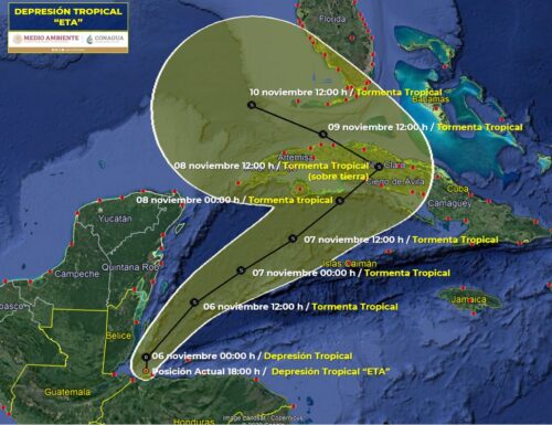 PLAYA DEL CARMEN, Quintana Roo, 05 de noviembre.- Para este viernes al medio día “ETA” regresará a la categoría de Tormenta Tropical al ingresar nuevamente en el Mar Caribe interaccionando con el frente frio número 11 ocasionando lluvias torrenciales en el sureste mexicano y la Península de Yucatán informó el Sistema Meteorológico Nacional.