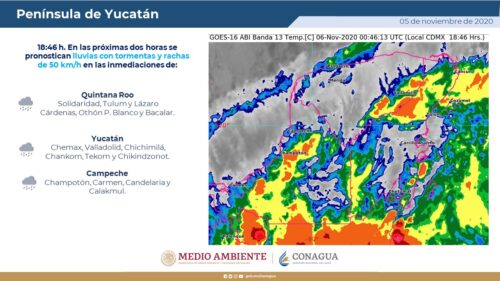 “ETA” por su amplia circulación ocasionará lluvias puntuales torrenciales en Chiapas, Tabasco y Quintana Roo, intensas en Campeche, Veracruz (sur) y Oaxaca (oriente), y muy fuertes en Yucatán por lo que recomiendan extremar precauciones a la población en general en las zonas de los estados mencionados por lluvias, viento y oleaje (incluyendo la navegación marítima) y atender las recomendaciones emitidas por las autoridades del Sistema Nacional de Protección Civil, en cada entidad.