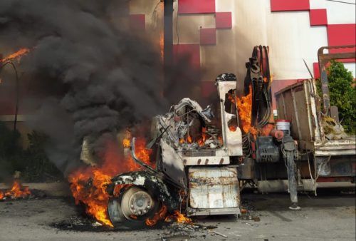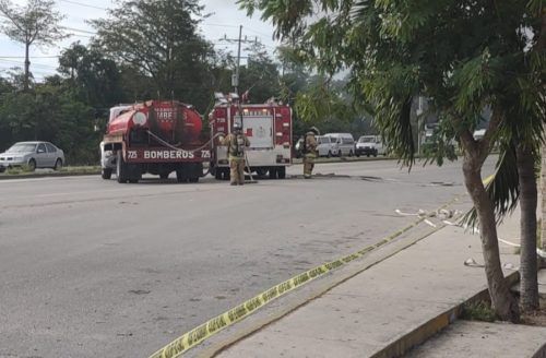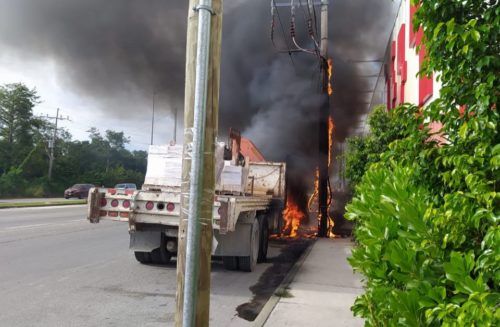 Un reporte al número de emergencias 911 alertó a los bomberos de Solidaridad para la atención de un siniestro en un camión de carga estacionado a un costado de la tienda departamental, en donde las mismas llamas quemaron algunas líneas de medio voltaje de la Comisión Federal de Electricidad.