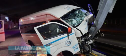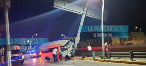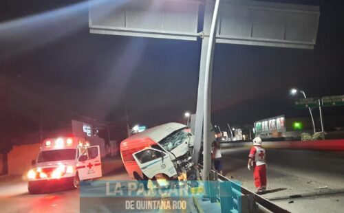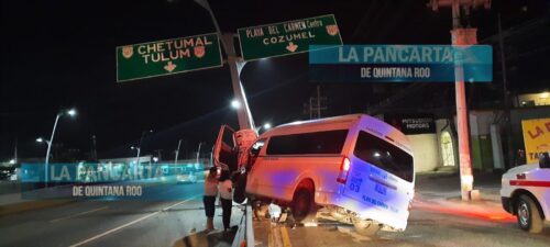 Playa del Carmen, Solidaridad, 12 de mayo.- Conductor de un colectivo foráneo de la ruta Playa-Tulum, quedó prensado dentro de su unidad marcado con el número económico 03, al chocar de frente contra un anuncio tipo bandera entre el puente vehicular y el bulevar, por lo que los bomberos tuvieron que usar las “quijadas de la vida”, para poder libéralo, su acompañante también resultó lesionada.
