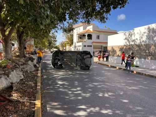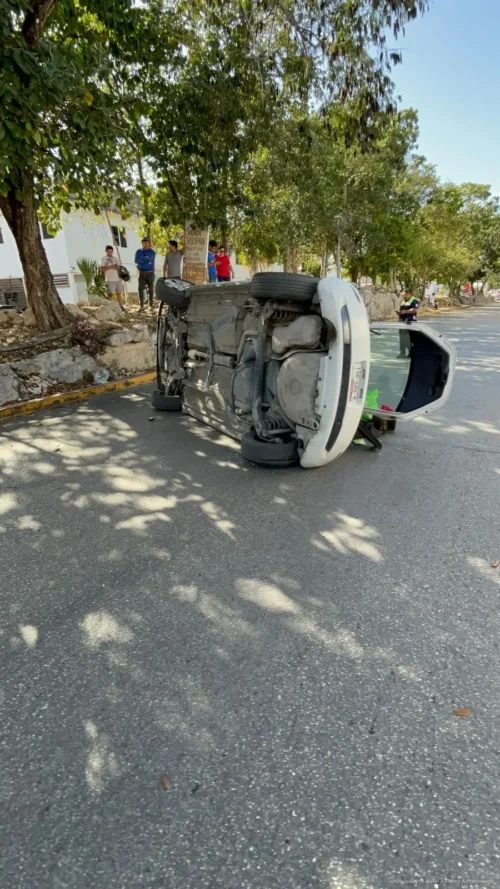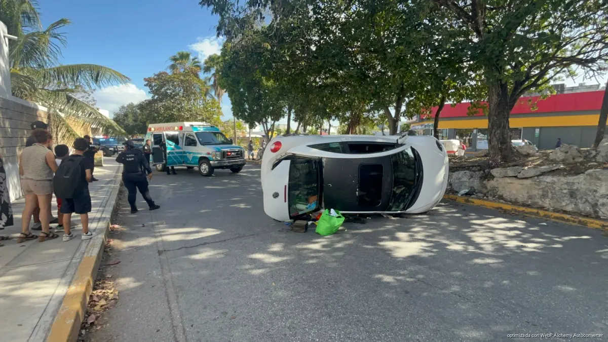 PLAYA DEL CARMEN, Quintana Roo, 28 de febrero de 2026.— Un conductor resultó lesionado luego de volcar su vehículo la tarde de este viernes en la vía principal del fraccionamiento Palmas 1, presuntamente por conducir a exceso de velocidad.