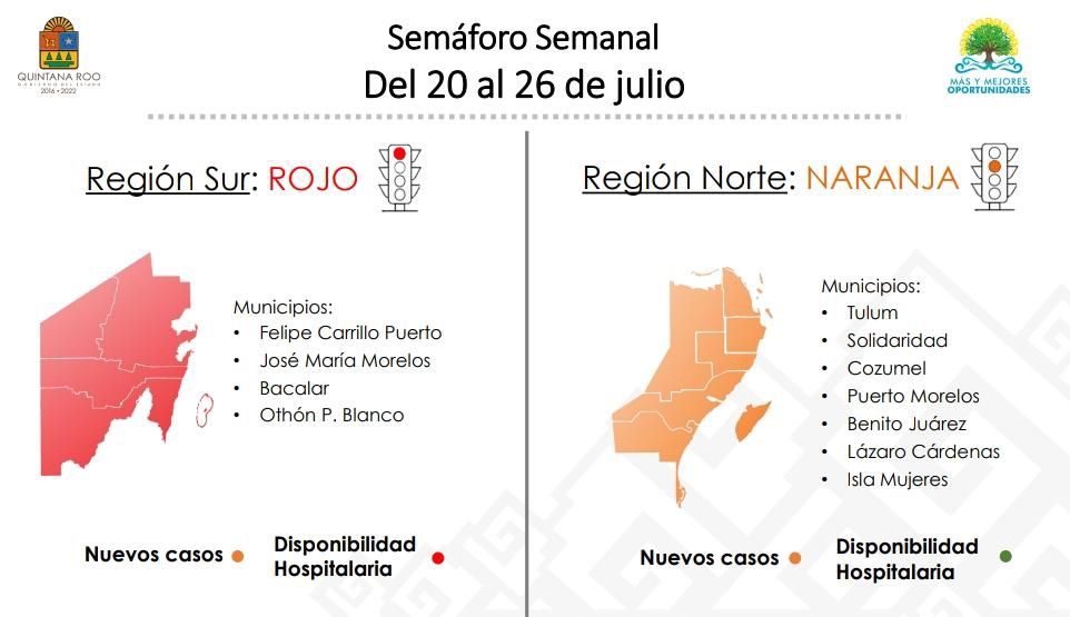 QUINTANA ROO, 17 de julio.- Durante la semana del 20 al 26 de julio el semáforo epidemiológico estatal estará en rojo en la región sur y en naranja en la zona norte anunció hoy el gobierno del estado de Quintana Roo que encabeza el gobernador Carlos Joaquín.
