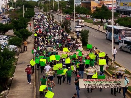 CANCÚN, Quintana Roo, 18 de noviembre. – Molineros integrantes de la Industria de la Masa y la Tortilla (CUN) acompañados de sus trabajadores marcharon por la avenida José López Portillo hasta el palacio Municipal de Cancún, con el objetivo de exigir el incremento de la tortilla a 22 pesos, debido a que ellos consideran que los precios a los insumos para producirla se han disparado.