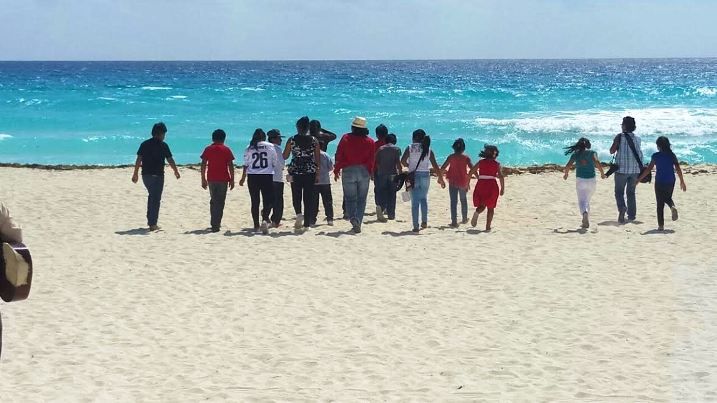 Los alumnos de la escuela Rafael Ramírez Castañeda recorrieron 226.22 kilómetros a bordo de camionetas tipo van, propiedad de la  transportadora Aventour, hasta llegar a Playa Delfines, donde los pequeños se tomaron de las manos y algunos vieron por primera vez  el mar. Acompañados de la guitarra de su profesor Don José, los denominados “aluxes”, interpretaron melodías en lengua maya. En Playa Langosta chapotearon, y entre risas hicieron castillos de arena junto al mar.