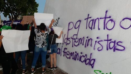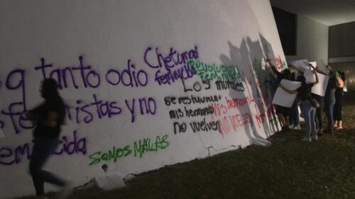 Tras exponer su inconformidad y encender veladoras en honor a las mujeres asesinadas, integrantes del Colectivo Marea Verde grafitearon las paredes exteriores del Poder Legislativo, que recientemente fueron pintadas.