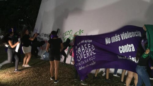 CHETUMAL, Quintana Roo, 12 de marzo. – De nueva cuenta el exterior del Congreso del Estado fue vandalizado por integrantes del Colectivo Feminista Marea Verde.
