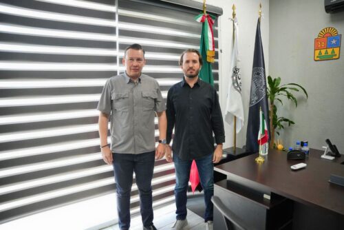 Playa del Carmen, Q. Roo., martes 12 de agosto de 2025.– Fernando Muñoz Calero, octavo regidor y presidente de las Comisiones Edilicias de Turismo, Ecología, Ambiente y Protección Animal del Ayuntamiento de Playa del Carmen, sostuvo una reunión con Carlos Montesinos García, nuevo titular de la Secretaría de Seguridad Ciudadana Municipal (SSCM), con el objetivo de reforzar las acciones encaminadas a la reconstrucción de la paz en el municipio.