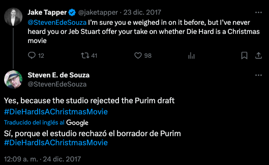 Como les contamos, en 2017 el guionista de ‘Duro de Matar’, Steven E. de Souza, confirmó a través de su cuenta de Twitter que el filme es navideño. Y lo hizo casi aplicando los mismos ejemplos que el historiador Jeremy Arnold en su participación en CNN.