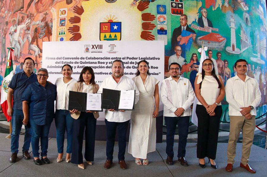 Chetumal, Quintana Roo.- El Poder Legislativo, a través del diputado Jorge Sanén Cervantes, presidente de la Junta de Gobierno y Coordinación Política firmó un convenio de colaboración interinstitucional con el Tribunal de Justicia Administrativa y Anticorrupción que preside la magistrada Minerva Maribel Moreno Cruz, con el objetivo de garantizar asistencia jurídica gratuita a personas sujetas a procedimientos administrativos que no cuenten con defensor particular.
