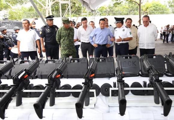 El gobernador Carlos Joaquín entregó equipo, por un monto de siete millones 770 mil 360 pesos, que consiste en 200 armas cortas y largas, cargadores, municiones, granadas, entre otros; de igual forma, entregó diplomas a los policías y mandos que se capacitaron en los diplomados de Derechos Humanos, Sistema Penal Acusatorio y Certificación Policial.