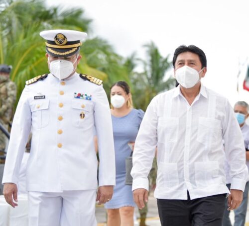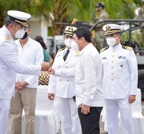 TULUM, Quintana Roo, 23 de noviembre. – El presidente municipal de Tulum, Víctor Mas Tah, acompañó este lunes a Pedro Joaquín Delbouis, presidente de Cozumel, en donde junto con las fuerzas armadas llevaron a cabo la ceremonia por el Día de la Armada de México, en las instalaciones del Hospital Naval de la isla.
