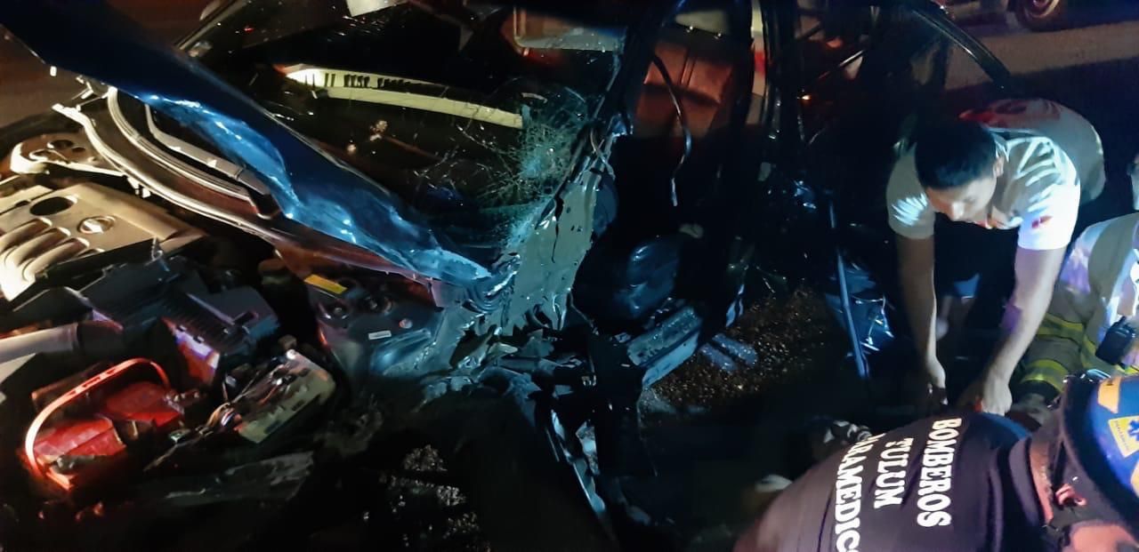 Y es que según refieren, el choque registrado entre una camioneta Nissan Estaquita color blanca con placas de circulación YP 85-59 A, del estado de Yucatán, y un vehículo Nissan Altima YZV 893 B del estado de Yucatán, dejó como resultado dos personas policontundidas y una más con posibles fracturas en el cuerpo, y que además tuvo que ser rescatado entre los fierros retorcidos del vehículo sedan.
